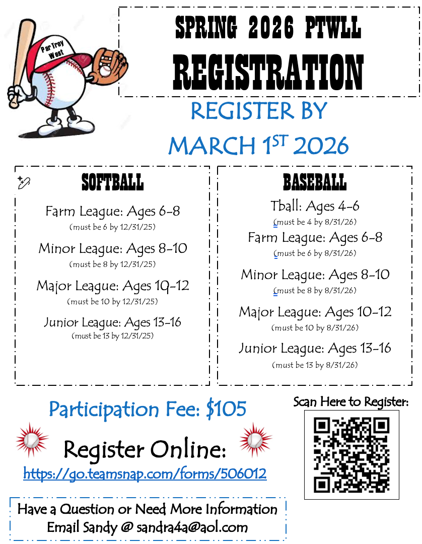 We are excited to announce that registration for the 2026 PTWLL Spring Baseball/Softball Season is NOW OPEN!! Don’t wait, Register NOW, and spread the word! The 2026 Registration Link is below and a flyer is attached with more information: 2026 Spring Registration Link: https://go.teamsnap.com/forms/506012 (if you have an issue when clicking on the registration link from your phone, try…